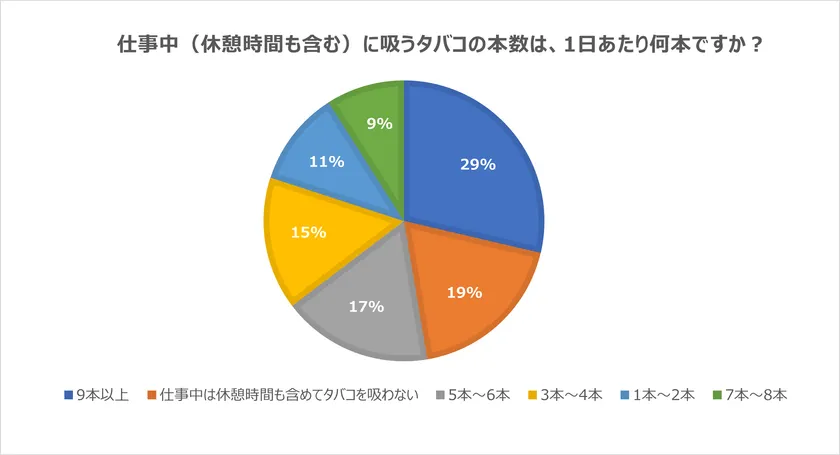 また、アンケートでは、仕事中に9本以上タバコを吸う方が、全体の29%にのぼっています。