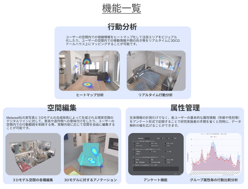 現実世界の『空間』をいつでもどこでも手軽に『体験』できるようになりました。体験時に利用者の行動データと視線情報をリアルタイムに可視化/取得できるので、得られた情報を分析していくことで利用者の行動や思考を理解するのに役立つと期待しています。建築内装空間の評価だけでなく、現実の店舗の売り場、広告物・POP、看板などのマーケティング施策/シミュレーションの効果計測ツールとしても活用していきたいと考えています。