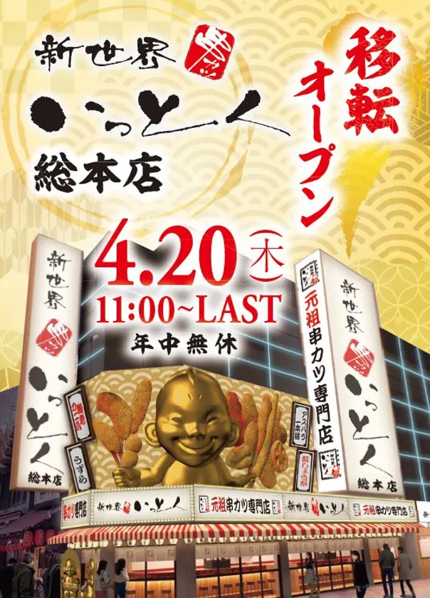 「新世界 串カツ いっとく 総本店」として4月20日(木)に移転オープンいたします。
