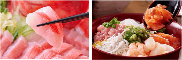【あたみ】【水葉亭】どちらの宿でも楽しめる、「金目鯛のお造り」(夕食)と、種類豊富な具材を盛り付けて楽しむ「のっけ丼」(朝食)はどちらも不動の人気メニュー。夜も朝も豪快な海鮮メニューをお楽しみください。