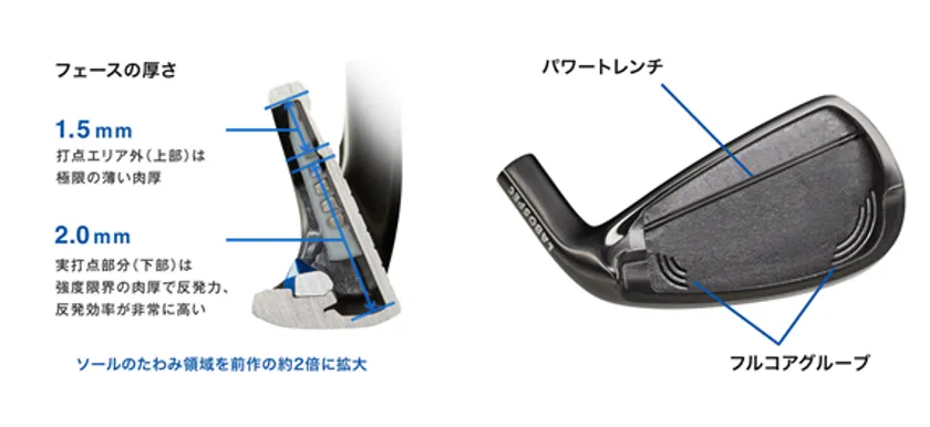 前作の約2倍にソールのたわみ領域を拡大したことで、トップ気味のオフセンターヒットでも飛距離のロスを低減。また、トゥ・ヒール部に3本の溝=フルコアグルーブを施し、高初速エリアを左右にも拡大。ミスでも飛ぶアイアンを実現。