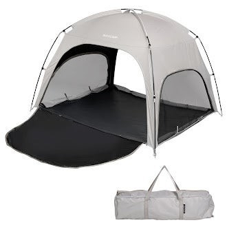 シーンに合わせて「オープン・メッシュ・クローズ」の3通りに切り替え可能。前後のドアに加え、窓も付いているため風通しは抜群です。フルオープンにすれば視界を遮るものがなく、シェード内にいながら最高の見晴らしを楽しめます。またドア部分を地面に広げればフロアの延長シートとなり、足を延ばしてくつろぐことも可能です。