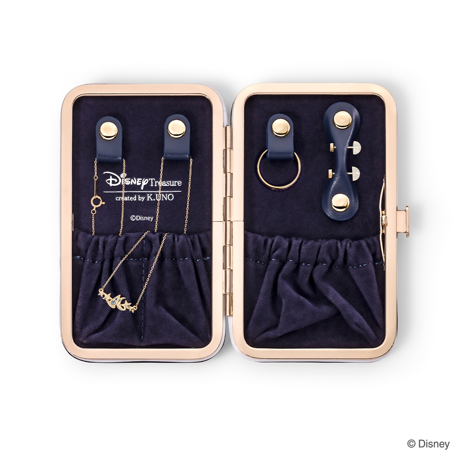 パール感のあるダークネイビーにシルバーの刺繍を施した、クールな印象のトラベルジュエリーケース。魔法使いの弟子に扮したミッキーマウスが夜空の星たちを指揮するシーンを描いた、ケイウノオリジナルデザインです。ケースの中身はスエード調のやわらかな布地を使用。高級感のあるダークネイビーにジュエリーがよく映えます。ネックレス・リング・ピアスなどが収納できます。手のひらにおさまるミニサイズ。年代を問わず使いやすい落ち着いた色味です。専用ケース入りなので贈り物にも。