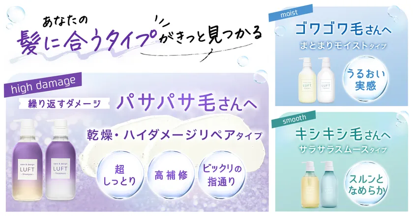 既存の「さらさらスムースタイプ」、LDK the Beautyで2022年ベストコスメを受賞した「まとまりモイストタイプ」に加え、新商品の「乾燥・ハイダメージリペアタイプ」。
