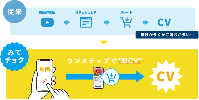 動画を触り直接商品を購入できることにより、無駄な遷移を省き購入意欲の高いまま即コンバージョンまで結びつけることができ、今までの動画プロモーションの課題であるカゴ落ちの多さを解決します。