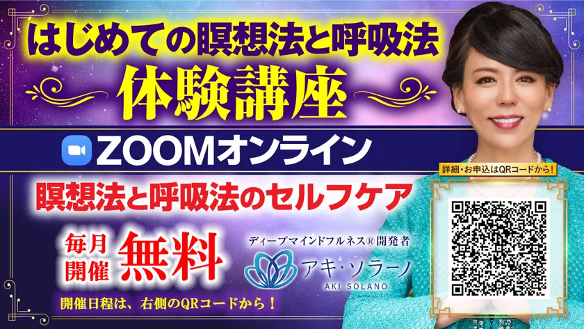 米国・ラスベガス在住の瞑想の専門家であり、世界最高峰のヨガ師範(E-RYT500)。著書「ミリオネアヨガマスターの9つの習慣」がAmazonヨガ部門で1位を獲得しているアキ・ソラーノが2023年5月よりZoomによる瞑想体験オンラインイベント「はじめての瞑想法と呼吸法 体験講座」を月1回無料で開催いたします。同時に自身YouTubeチャンネルをリニューアル。「瞑想で人生好転|アキ・ソラーノ」を始動いたしました。がん闘病中の夫と自身を支える瞑想を多くの方に届けたいとの想いからがん患様や家族さまに向けた瞑想も配信いたします。