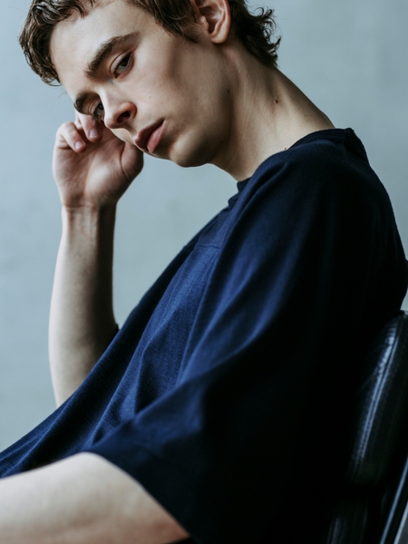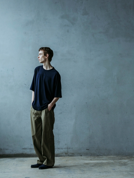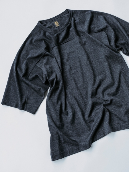 この生地を使って、古着のフットボールTシャツの形をベースに別注しました。古着には存在しないウール100%のフットボールTシャツは、身幅もボックスシルエットに仕上げる事で軽やかに着用する事が可能になりました。