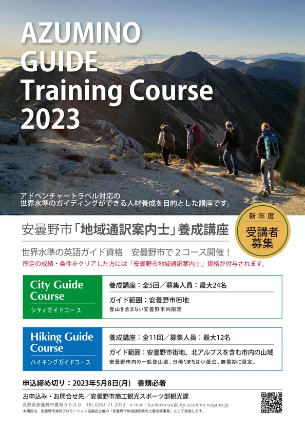 安曇野市海外プロモーション協議会(所在地:長野県安曇野市、代表者:小岩井 清志)は、市街地観光、及びハイキングにおいて、英語や日本語を用いて世界水準のガイディングができる人材を養成する講座を開催します。