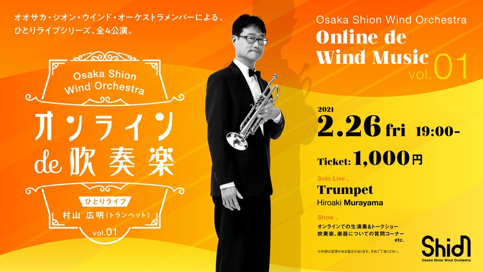 オオサカ・シオン・ウインド・オーケストラメンバーによる、ひとりライブシリーズ全4公演。先陣は、トランペット奏者:村山広明。オンラインでの生演奏&トークショー、吹奏楽、楽器についての質問コーナーなど、必見です!吹奏楽でのトランペットの魅力を存分にお楽しみいただける公演です。