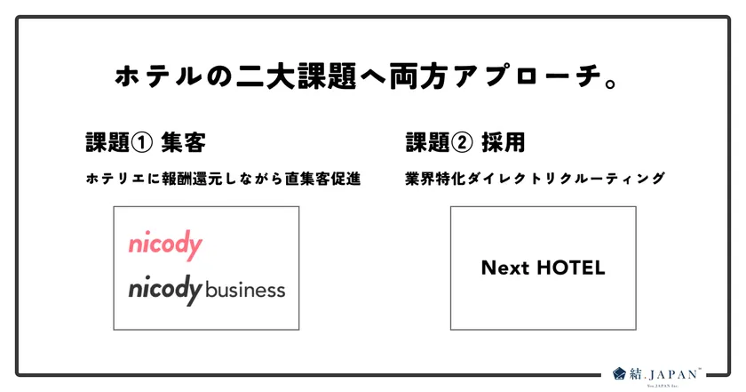 業界変革に意欲的な方々と携わっていく中で、様々なホテルの状況をお伺いすると、人手不足や採用に困っているケースが多いと感じ、この度「Next HOTEL」をリリースさせていただきました。その結果、以前から提供している旅行計画アプリ「ニコディ(nicody)」と組み合わせることで、宿泊業界の二大課題である「集客」と「採用」の両方へ同時にアプローチすることが可能になりました。引き続き新しい宿泊業界のあり方を提案し、観光業界を変えていける企業へと成長してまいります。