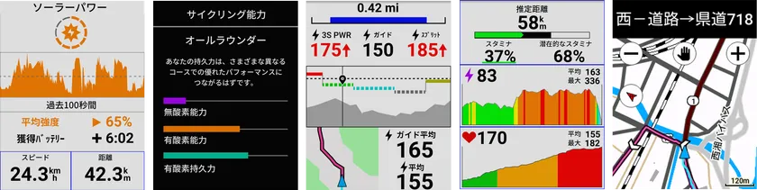 左から、ソーラー充電、サイクリング能力、パワーガイド、リアルタイムスタミナ、地図