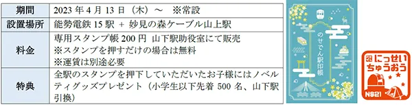 開業110周年を記念して、各駅をめぐり楽しんでいただける駅スタンプを設置します。能勢電鉄ならではの駅名と駅にちなんだイラストで親しみやすいスタンプをお楽しみいただけます。