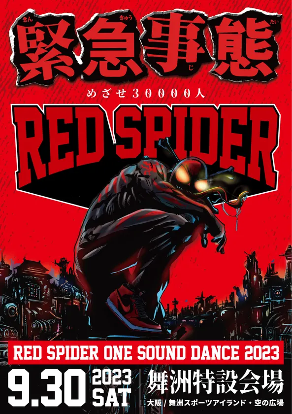 ダンスホール・レゲエ・シーンにおいて、20年以上にもわたってトップ・ランナーとして大阪を拠点に活躍を続ける最重要人物RED SPIDERは、「目指せ30,000人」の目標を掲げた大規模単独野外ライブ『緊急事態 -RED SPIDER ONE SOUND DANCE 2023-』を2023年9月30日(土)に舞洲スポーツアイランド・空の広場(大阪府大阪市此花区北港緑地2丁目1)で開催します。また、チケットの一般発売が2023年4月7日(金)より各種プレイガイドで開始されます。