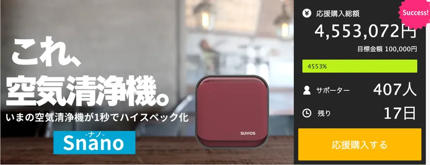 輸入物販事業を手がけるTORITEMP LLC(所在地:福岡県)は、「手のひらサイズでフィルターレス。さらに“あなたの空気清浄機”をハイスペックにする Snano(エスナノ)」の先行予約販売を、応援購入サービスMakuakeにて2023年3月11(土)に開始し、目標金額10万円に対し450万円を達成しております。本プロジェクトは4月23日(日)まで実施いたします。
