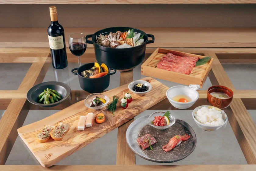 大阪 北堀江の名店「肉割烹 ASATSUYU( https://asa-tsuyu.com/ )」様が監修する地産の厳選素材を中心とした選べるコース料理スタイルです。