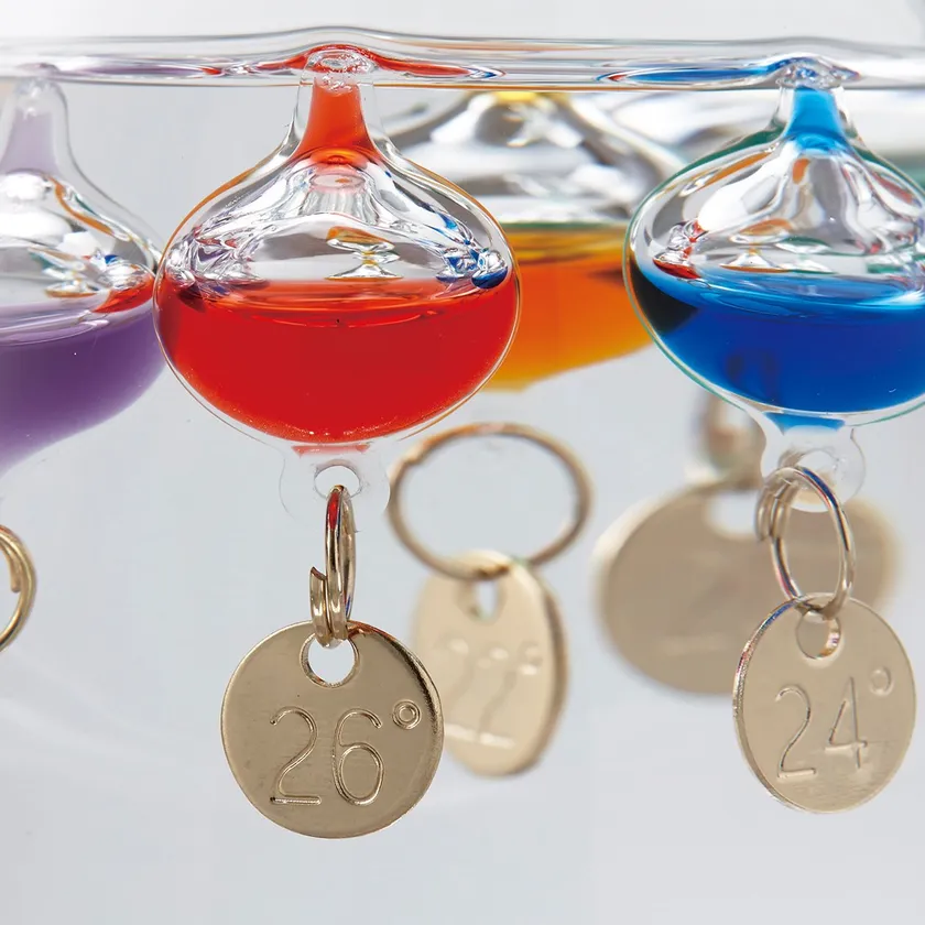 物理学者のガリレオ・ガリレイが発見した『液体の比重が気温によって変化する』原理を用いて作られた温度計。実際の気温は上層部に浮いているガラス球体の、最下段のガラス球体に付いているプレートで読み取ります。