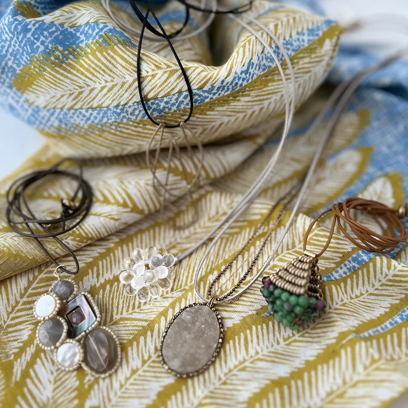 5年前に企画が始まったペンダント企画[OVAL]は、金属アレルギーでお悩みの方のお声からスタートしました。遊びゴコロのあるTOPをかろやかなコードで仕上げたペンダントは、サッと気軽に着けられて、胸元のVラインでスッキリ!テールに付けたシリコン入りのスライドパーツでレングスが簡単に調整でき絶妙なバランスでピタッと止まるので、金具の取り付けが苦手な方でも楽々です。
