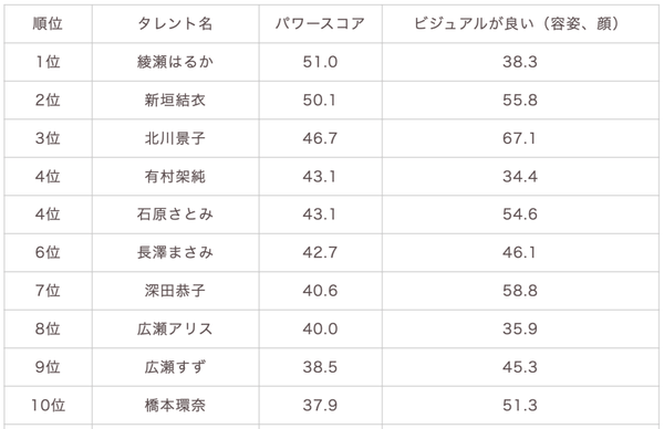 パワースコアが高い女優=ビジュアルスコアも高いのかということをタレントパワーランキングを用いて検証。