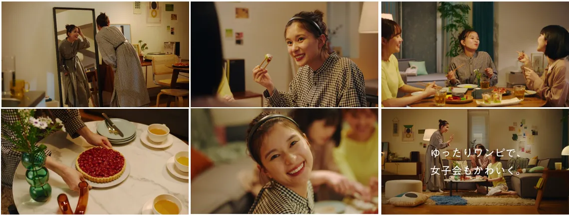 「ワンピース」を選んで「enjoy HOME」篇が始まると、鏡の前でおめかししている芳根さんの姿が。着心地の良さとかわいさを両立したワンピースを着て、今日は友達を招いてホームパーティーです。お腹いっぱいご飯を食べた後「甘いものは…別腹だよね~!」と盛り上がる3人。賑やかな笑い声に包まれます。