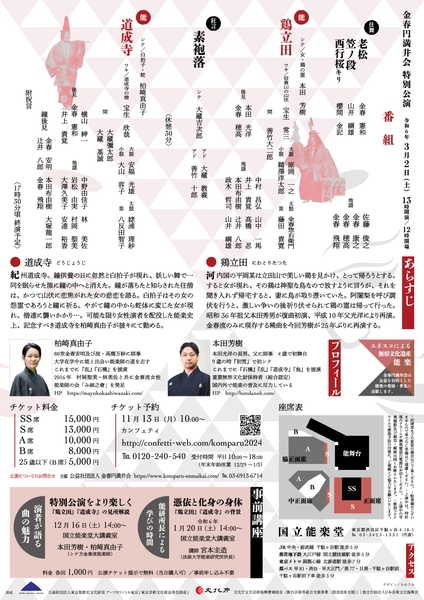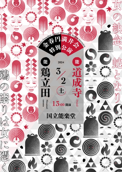 公益社団法人金春円満井会主催、『金春円満井会特別公演~女の執念、蛇となり 鶏の祟りは女に憑く』が2024年3月2日 (土)に国立能楽堂(東京都渋谷区千駄ヶ谷4-18-1)にて上演されます。