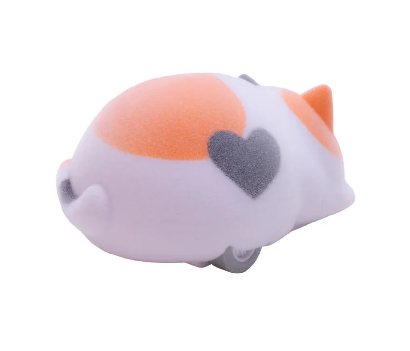 表面は、つい触りたくなるふわふわな素材のフロッキー加工が施されています。柄によって尻尾の向きが違ったり、ピンクの肉球もかわいいねこちゃんたちです。ミケ柄にはハートの模様がついており、細部までこだわったデザインです。