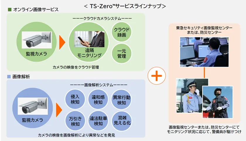 東急セキュリティ株式会社(本社:東京都世田谷区、代表取締役社長:下形 和永、以下「東急セキュリティ」)は、これまでにクラウド録画型カメラやAI画像解析技術と警備オペレーションを組み合わせた「オンライン画像サービス」や「画像解析サービス」を提供していますが、今般、東急セキュリティが提供する監視カメラ、AI技術と警備オペレーションを組み合わせたサービスの総称を「TS-Zero(TM)(ティーエスゼロ)」と決定いたしました。