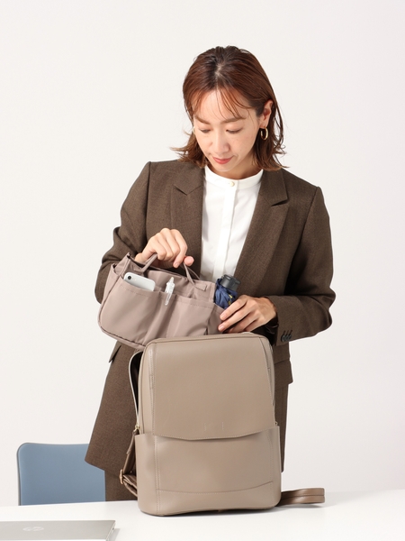 商品は、軽量で雨の日でも安心な合皮素材を採用したシンプルなスクエア型で、訪問先でのカジュアルな印象や電車通勤の際の前持ちを解消するため、トートバッグとしても持てる2WAY仕様としました。カラーは、ブラックに加え要望の多かったモカ・グレーを作成。ブラックは、ナイロン×合皮素材のミックスも追加しました。また、クッション性のあるPCポケットはもちろん、肩への負担を軽減する少し太めのショルダーやバッグを開けずに取り出せる名刺入れポケットを設置するなど工夫を施しています。その他、単体でも持ち運びができ、スマホやメイク道具などを収納できるバッグインバッグを付属するなど、こだわりの詰まったアイテムに仕上がっています。