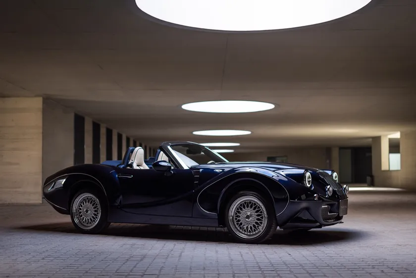 起伏に富んだボリューム感のあるデザインで、フェンダーがクラシックカーの雰囲気を醸し出しており、ベース車両の面影はありません。ベース車両に対して全長が29cm長く、幅が5.5cm広く、全高が1cm低くなっていますが、車重はベース車と同じ990kgというのも特徴です。ボディカラーはお客様の好みで選択が可能です。