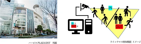 ハービスPLAZA ENT地下2階に設置したカメラに、アジラが開発・提供するラインクロス検知機能等の行動認識AIソリューションを導入することで、店舗前の通行者数及び店舗への入店者数、その性別や年齢などの属性、複数カメラ間での同一人物検知による買い回り行動データの取得・解析を行います。この実証実験から得られる知見を活かし、お客さま・入居テナントさまにとって、より魅力的な施設運営を目指してまいります。