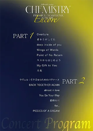 さらにインタビューの公開とあわせて、コンサートでの演奏プログラムも全曲発表された。インタビュー中のCHEMISTRYからも新たに追加される楽曲への期待が語られ、単なるアンコール公演に留まらないさらなる「挑戦」を想像させる内容となっている。