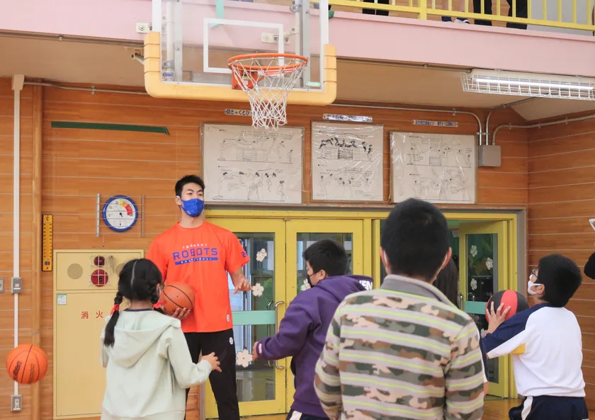 現役のプロバスケットボールチームの選手やコーチが一緒に試合をしたり、プロの技術を披露したり、子どもたちにスポーツの楽しさや喜びを伝える授業です。