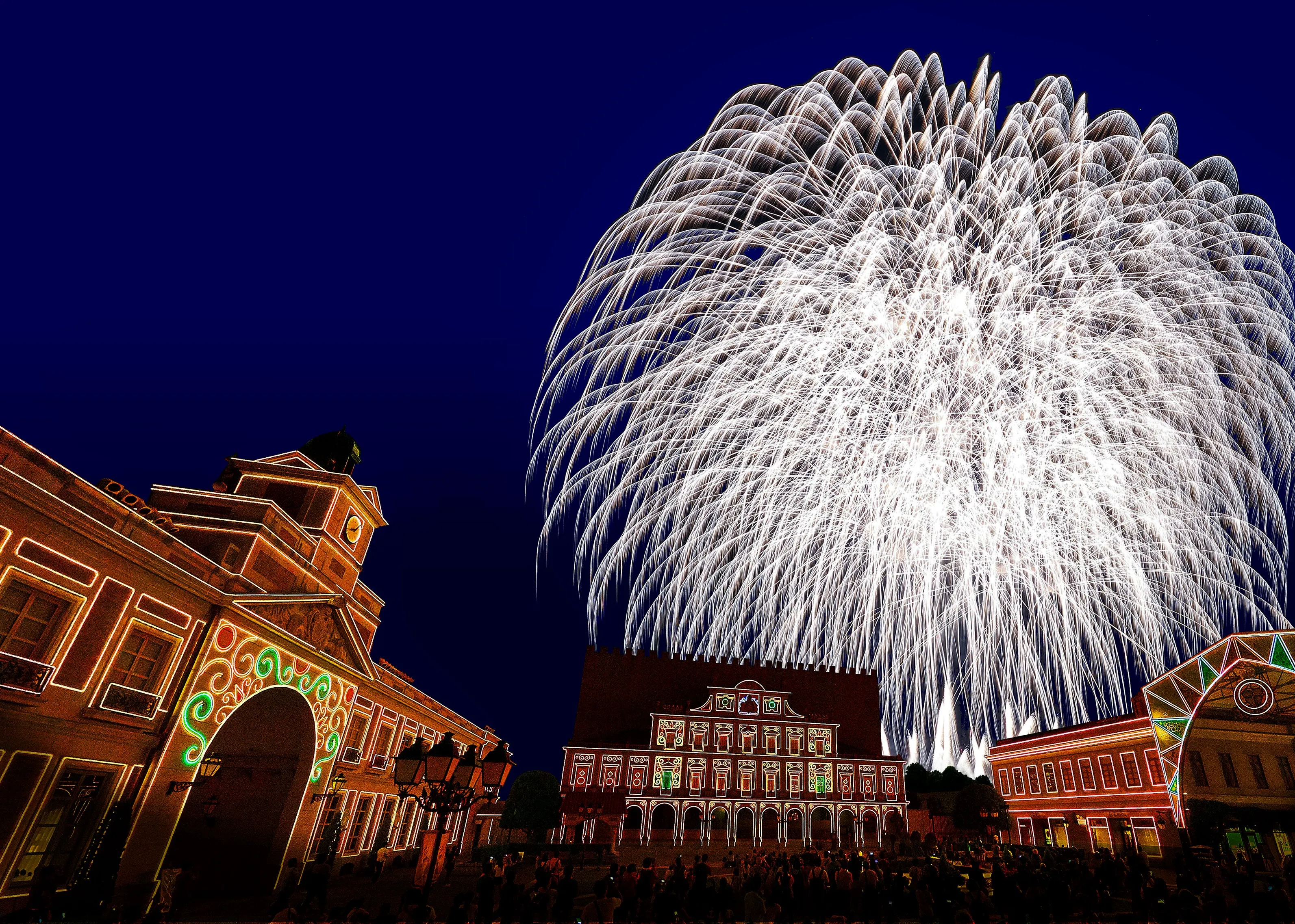 イルミネーションで彩られたナイトパレード「エスパーニャカーニバル“アデランテ”」、夜空いっぱいに広がる大迫力の花火と音楽の競演「ムーンライトフィナーレ」を上演いたします。志摩スペイン村のテーマソング「きっとパルケエスパーニャ」の音楽にのせて花火が次々と打ちあがり、広場は感動と拍手に包まれます。志摩スペイン村ならではの華やかな夜をお楽しみください。