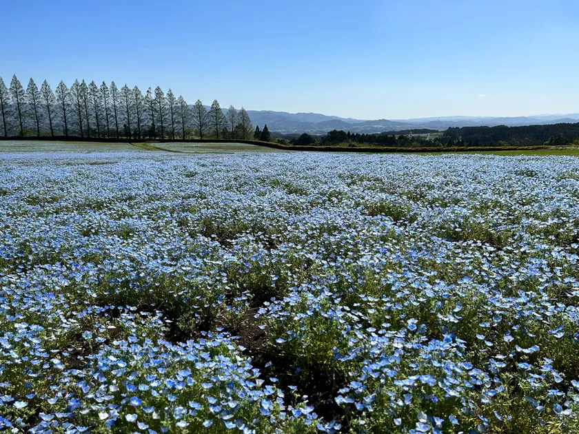 青く可憐な花を咲かせる一年草のネモフィラが広大な敷地を青く彩る景観は、宮崎ではまだ珍しく、訪れた観光客は写真撮影をしたり散策を楽しんでいます。