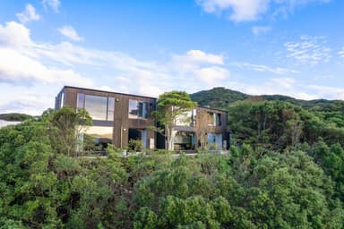 (2)淡路島の建築家 平松 克啓(ヒラマツグミ)の設計によるエッジの効いた三角形の建造物は、リビングや寝室から一望できる福良湾の絶景と、随所に散りばめられた和紙やタイルが織りなすラグジュアリーな室内空間でお客様をおもてなし致します。