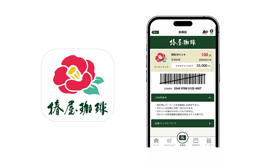 図1 『椿屋珈琲グループアプリ』アイコンと会員証画面
