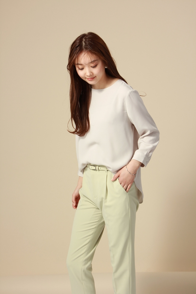 今回の商品は、Tシャツほどラフにならず、ブラウスほどかっちりしすぎないデザインのTブラウスです。前後差のある着丈にしていることから「前だけイン」が可能となり、気軽に1枚でも着用ができます。また、8分袖にすることで手首を華奢に見せ、スッキリとした印象になります。その他、背中にゴールドの釦や袖口にクルミ釦を採用するなど、細部にまでこだわったブラウスです。