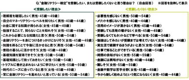 他方、≪受験したくないと思う理由≫では「必要性を感じない」や「メリットを感じない」、「活用のイメージが湧かない」、「受験しても活用の場がない」、「受験しなくてもネットなどで学べる」など、意義を見出しにくいとする回答が多くありました。また、「実生活で経験するほうがよいと思う」や「仕事で知ることができている」など実際の経験で十分とする回答のほか、「時間の余裕がない」や「難しそう」、「金融や数字は苦手分野」といった回答がありました。