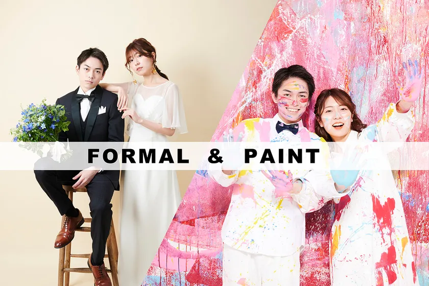 ウェディングドレスやタキシードを着て、フォーマルなウェディングフォトの前撮りもしたいし、人気のウェディングペイントにも興味がある。そんな2人にぴったりの新プランが「FORMAL&PAINT」です。