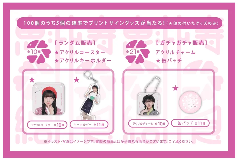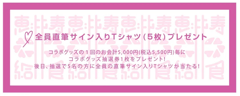 グッズのお会計が5,500円以上のお客様に抽選で「全員直筆サイン入りTシャツ」が当たる、シリアルNo入り抽選券を贈呈。また、5%の確率でサイン入りグッズが当たるガチャガチャを各会場に設置しております。