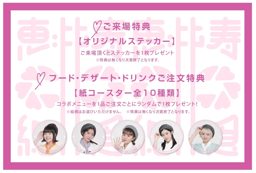 ※フード、デザート、ドリンク注文特典としてメニュー1品注文ごとにランダムで1枚紙コースターをプレゼント。