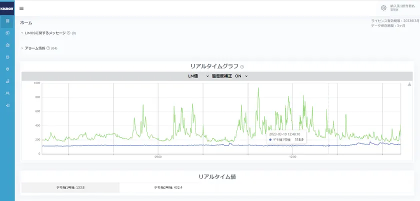 クラウド対応版LIMOSではモバイル通信(ドコモ回線)を採用しているため、電波が届く範囲であれば設置場所を問わずご利用いただけます。また、測定データはWEBブラウザ上で管理されるので、パソコンやスマートフォンがあれば在社、在宅勤務問わず臭気の管理、監視が行えます。また、測定データはクラウド上に最大3か月保存され、CSVファイルでの出力が可能です。