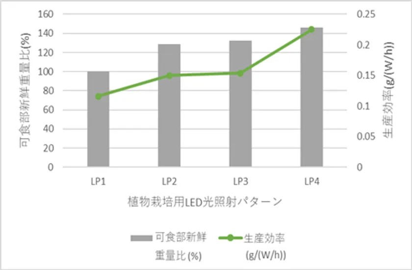 図2. 光照射パターンごとの可食部新鮮重量比と生産効率