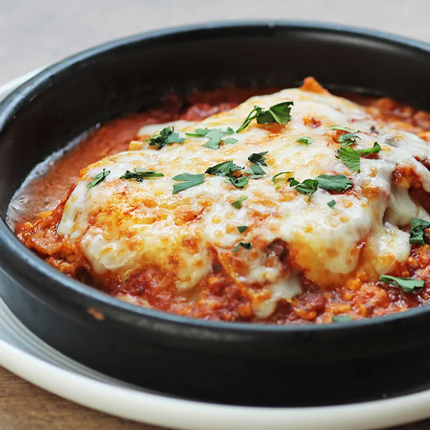 サルヴァトーレ特製ミートソースのラザニアを窯焼きスタイルで仕上げました。