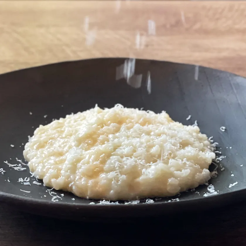 大きなチーズで仕上げる絶品チーズリゾットを楽しんでください。