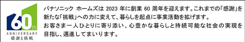 パナソニック ホームズ株式会社は、2023年に創業60周年を迎えました。創業以来これまでの「感謝」と、これからの時代への「挑戦」を掲げ、お客さまと社会への一層のお役立ちとともに、持続可能な社会への貢献を目指してまいります。