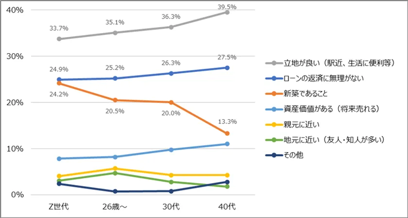 住宅の購入にあたり優先することを聞いたところ(図8)、各世代で立地の良さを求める声が多く挙がりました。世代間で差が大きかった「新築であること」は、Z世代の24.2%に対し、40代では13.3%と10ポイント以上の開きがありました。