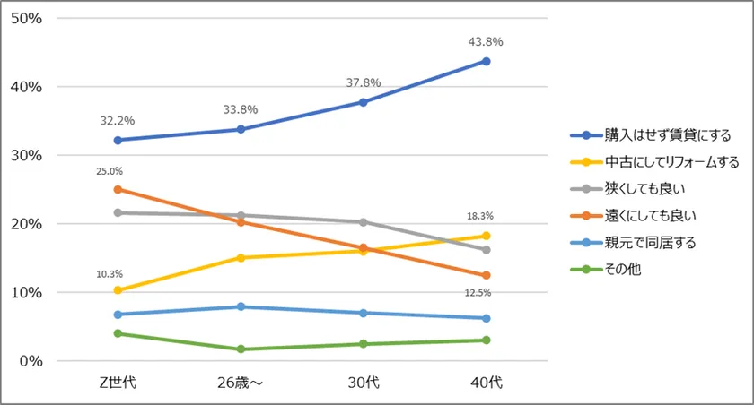 住宅の購入にあたり制約があった場合、仮に費用が足りなかった場合にどうするかを聞いたところ(図9)、各世代で賃貸にするとの声が多くなりましたが、Z世代では「遠くにしても良い」、「狭くしても良い」の意向が聞かれました。先の設問(図7、8)とあわせて見ると、特にZ世代で新築一戸建てに対する憧れがあるようです。