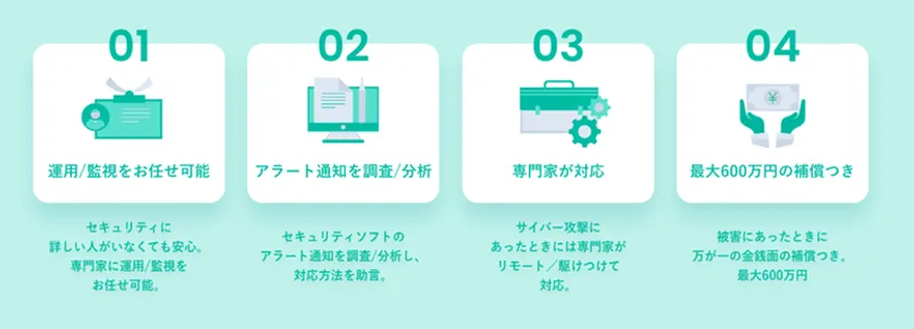 ソフトクリエイトが中堅・中小企業向けに2021年2月から提供する『パソコン監視サービス』に、サイバー攻撃被害時の駆けつけ対応や、その後の補償を追加した新しいサービスです。被害発生後の対策・補償が加わり、低価格でより安心が得られるサービスです。「IPAサイバーセキュリティお助け隊サービス*」に認定され、IT導入補助金の支援対象となりました。