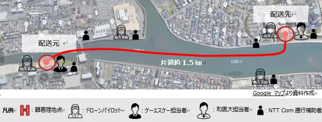 本実証実験では、近畿地方に根差した医薬品卸業者であるケーエスケーが、和医大から医薬品の発注を受けたことを想定し、和歌川河川公園テニスコートから病院内施設屋上まで、ドローンにより偽薬を配送しました。