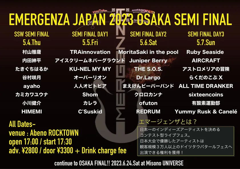 世界最大級のインディーズライブコンテスト 「エマージェンザ・ジャパン2023」セミファイナル開催
